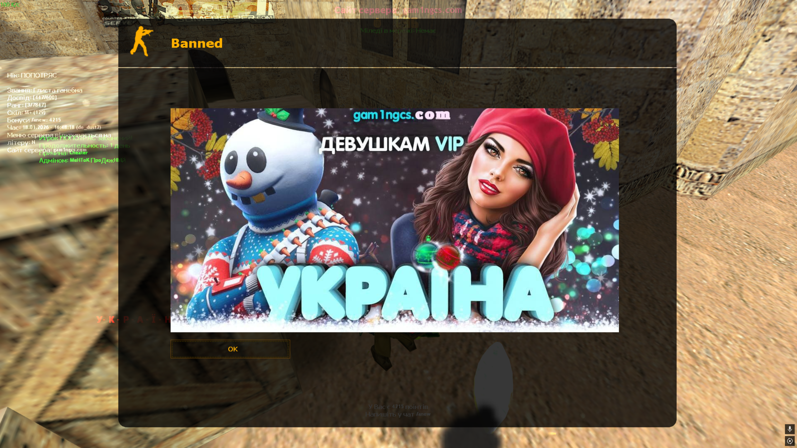 Зроблено скріншот гравцю ПОПОТРЯС адміном █ У- К - Р - А - Ї - Н -А 亗 DE_DUST2 ONLY █